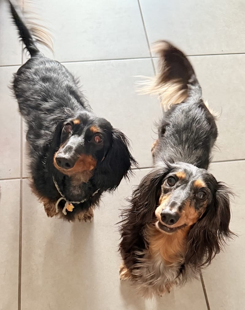 Suite à une séparation, mon ex-mari étant parti à Bordeaux poursuivre sa carrière dans les jeux vidéo, il est également parti avec Jean-Paul, l'un de nos deux petits teckels 😠Mais qu'à cela ne tienne : j'ai encore Simone dans les pattes, et cet été j'ai eu le plaisir de garder sa maman, Olympe. Regardez-moi ces deux petits démons sur pattes ! Elles étaient adorables et se sont super bien entendues.