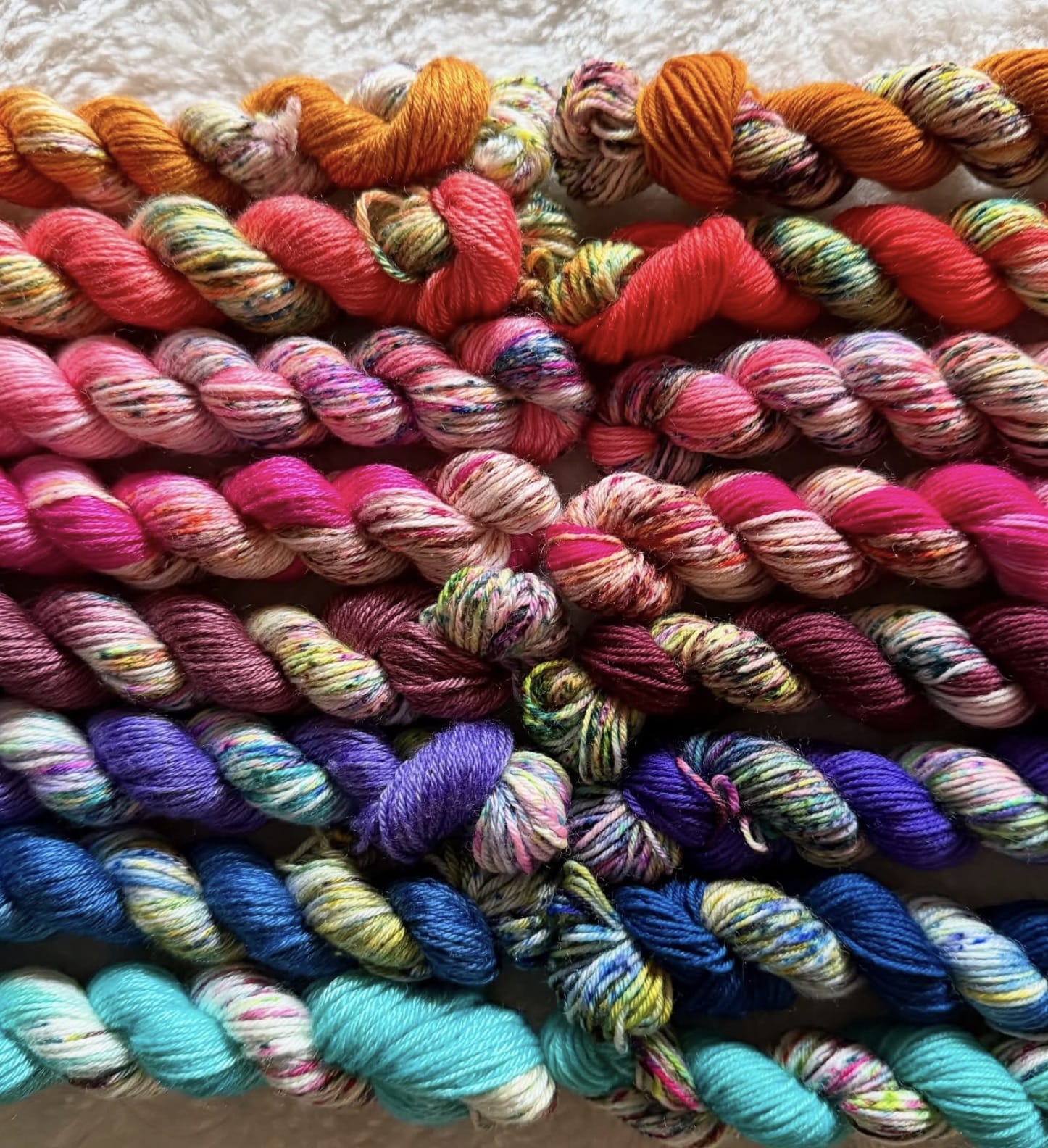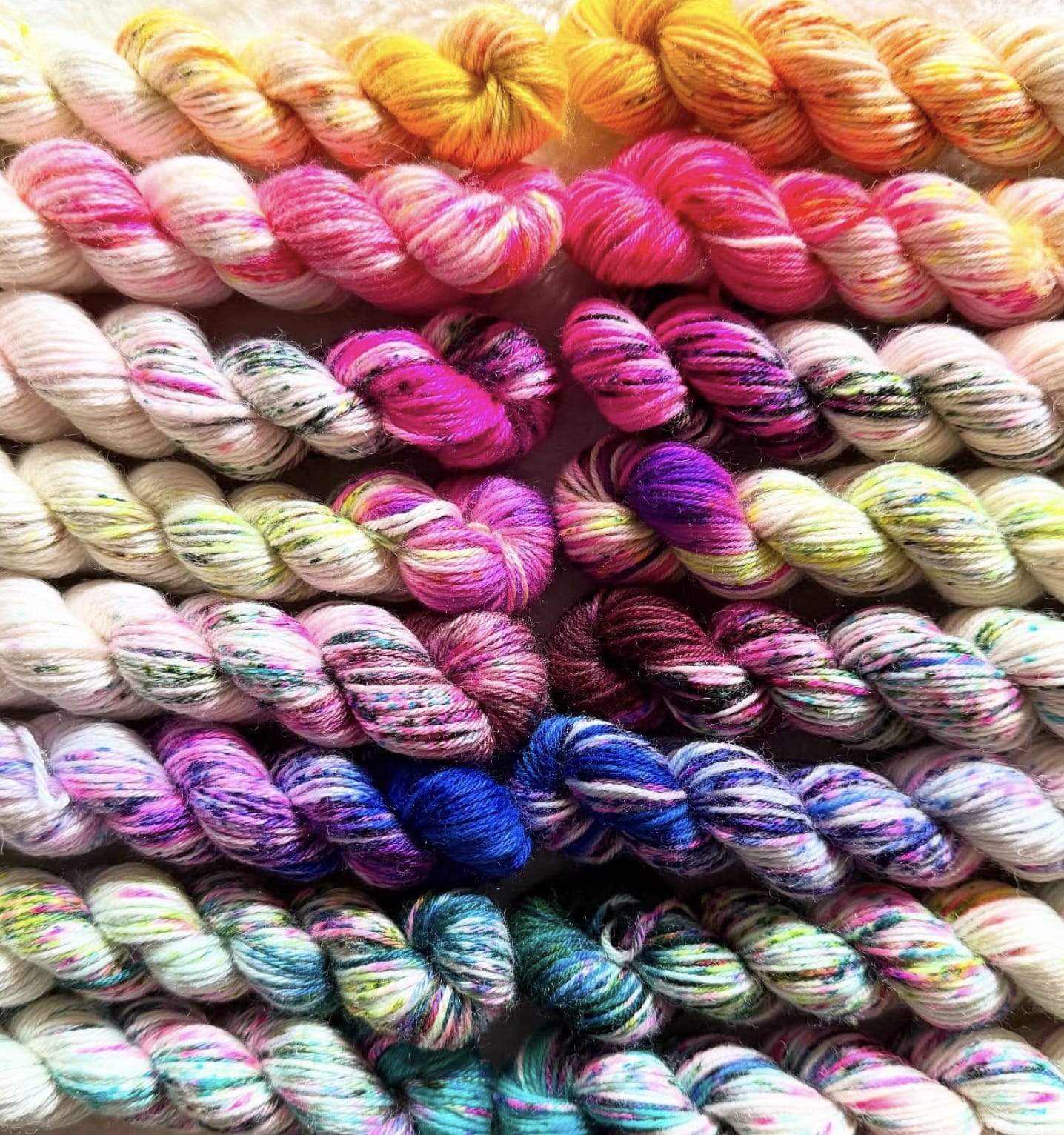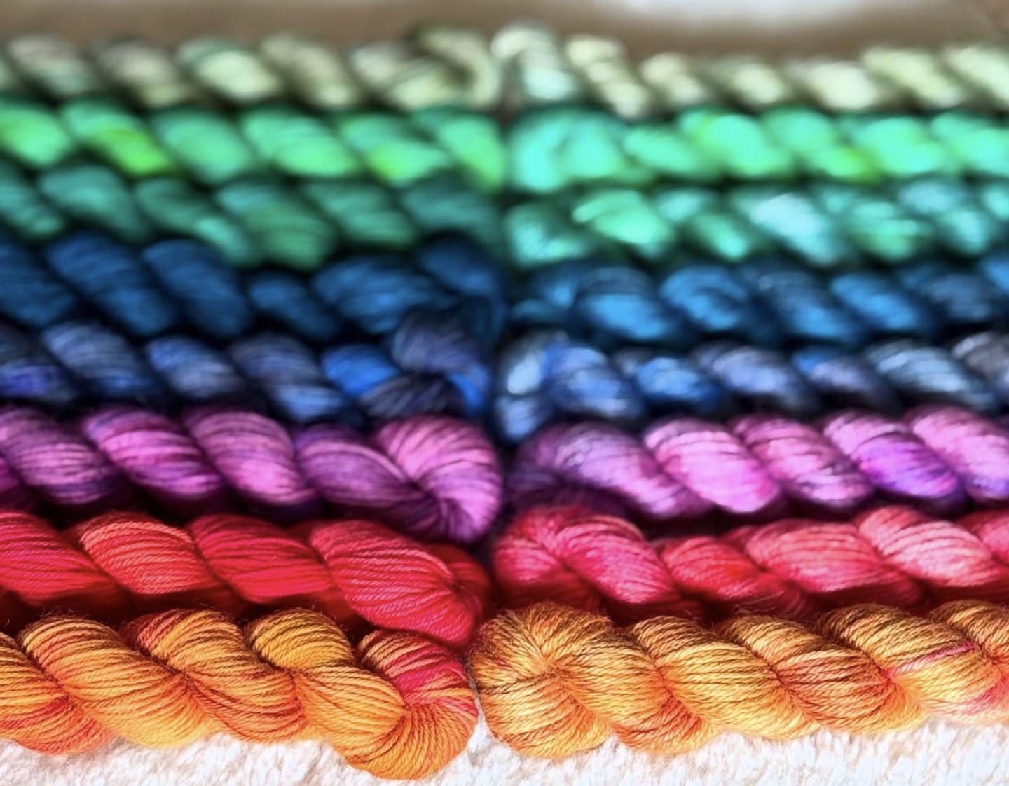 L'année dernière, je vous avais proposé un calendrier à 3 ambiance, 3 fois 8 écheveaux teints avec 3 techniques différentes. Allez, pour le plaisir des yeux :